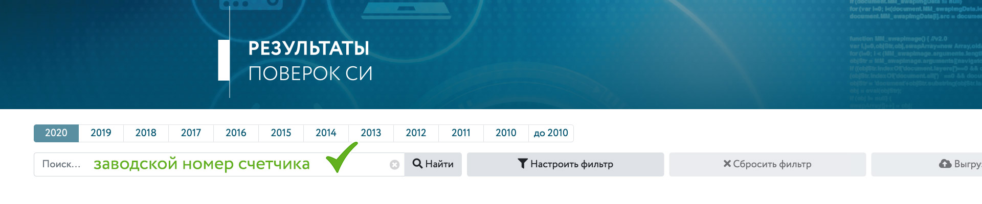 - В случае отсутствия данных следует проверить правильность указания номера учетного оборудования (лишние/отсутствующие пробелы, цифры, буквы или наличие года выпуска прибора, который указывать не нужно).